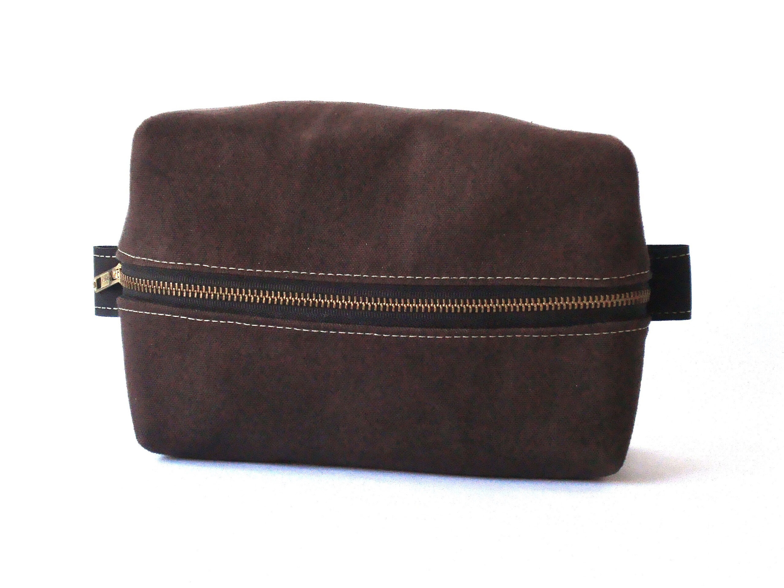Holds all your toiletry essentials while traveling. Item can be customized with a leather patch with up to 3 letter initials.